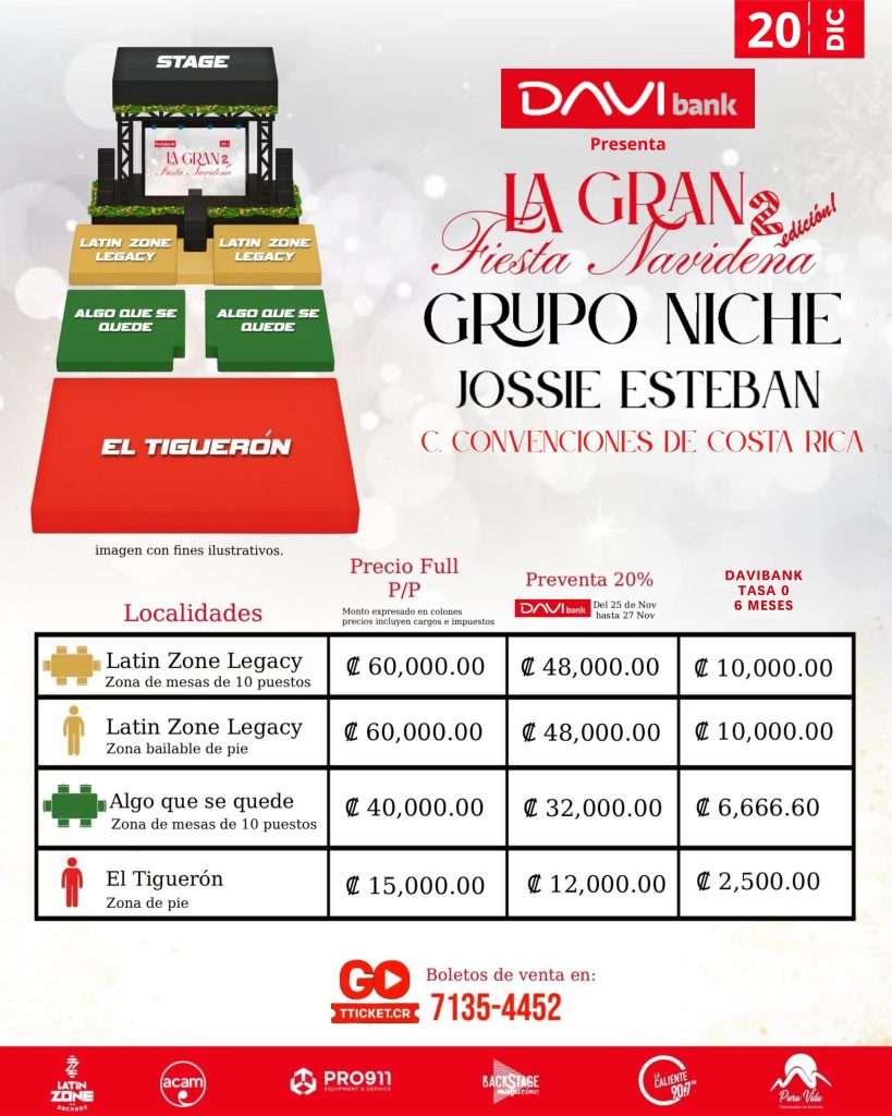 | Latin Zone Legacy | Zona de mesas (10 puestos) o bailable de pie | ₡60,000 | ₡10,000 |